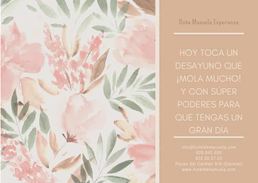 DESAYUNO “DOÑA MANUELA”Disfruta de un Desayuno Buffet con una gran variedad de productos dulces y salados. Reserva previa-Contacta con nosotros. Horario de Lunes a Viernes de 7.30h a 10h, Fines de semana y festivos de 8h a 10.30hLeer másLeer menos